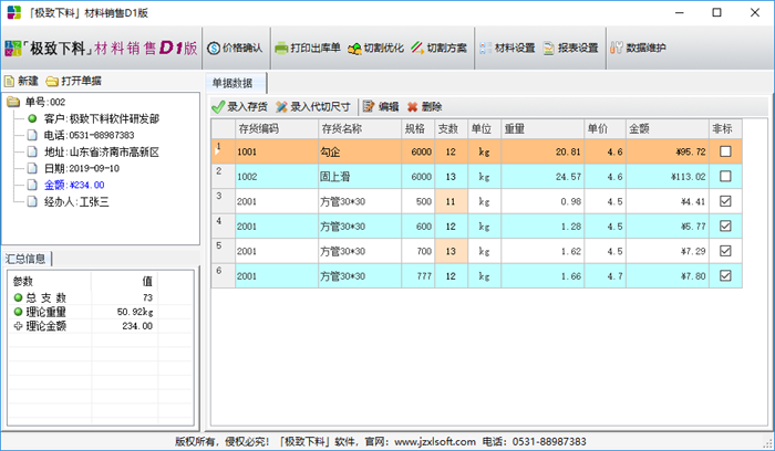可以通过事先设置好材料的米重,软件根据米重自动计算出理论重量。只要输入相关尺寸长度,软件即可计算出客户采购的理论重量、理论金额,方便销售企业快速报价,而不需要称重。
